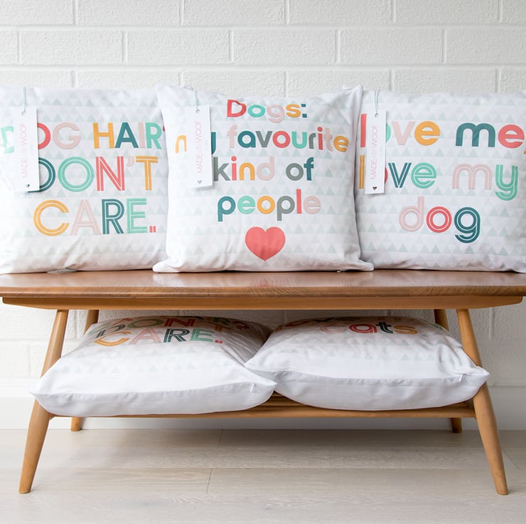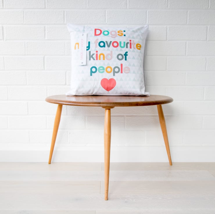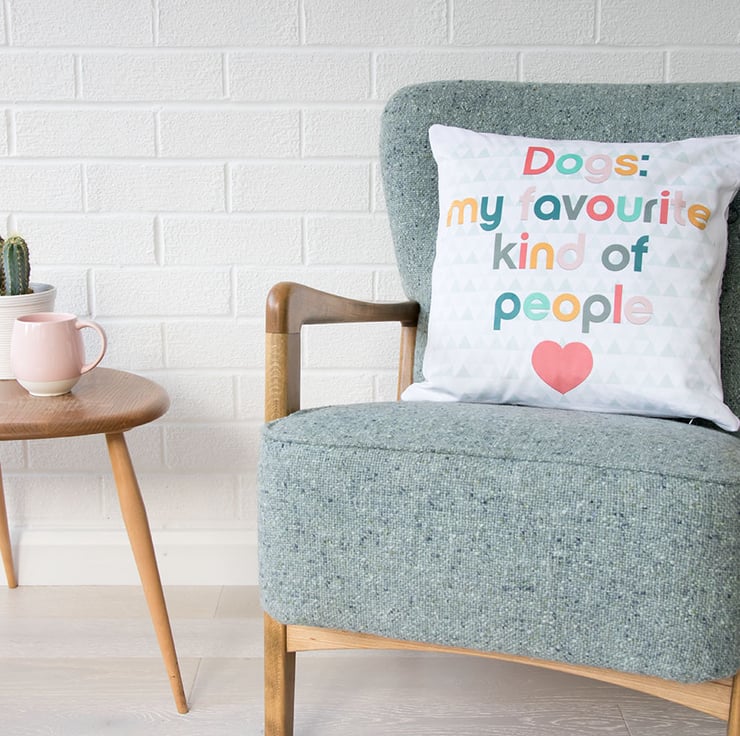 This 'Dogs - my favourite kind of people' design is modern and geometric and printed onto a quality super soft touch cushion cover. The cover has a faux suede neutral light grey backing with a concealed zip. The approximate size of the cushion cover is 460mm x 440mm.