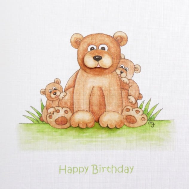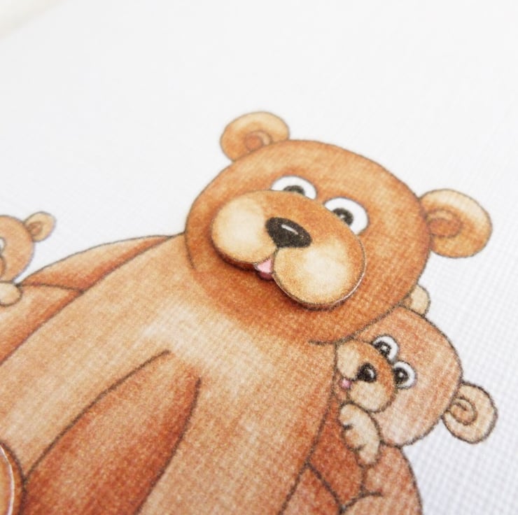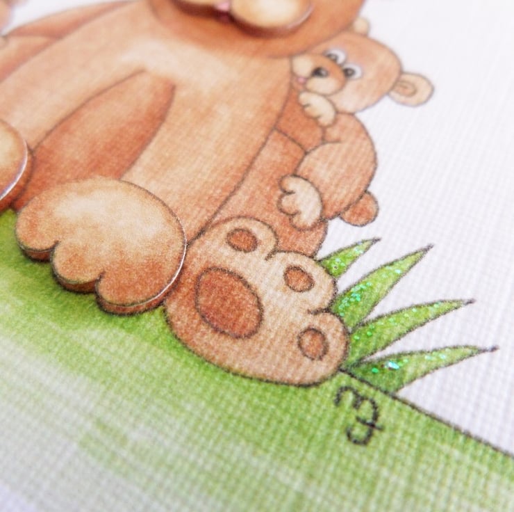 This cute daddy bear card has been designed using my own original watercolour illustration. The card has been printed out onto good quality linen embossed card and decoupaged up in parts. The card has been finished off with a little glitter detail.