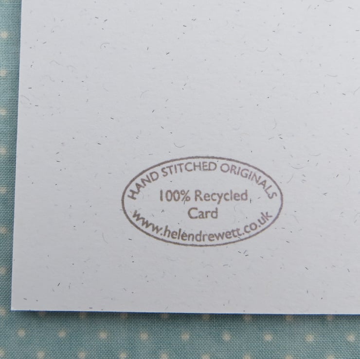 The card measures 12 x 9 cm (5" x 3.5") and comes with a pale cream recycled paper envelope in a protective cellophane sleeve. The card is signed on the front and my studio stamp is on the back. Cards are made from stout 100% recycled card - blank inside. There is room for me to write the name of the baby beneath the miniature textile if you would like me to: For....................with love, just let me know.
