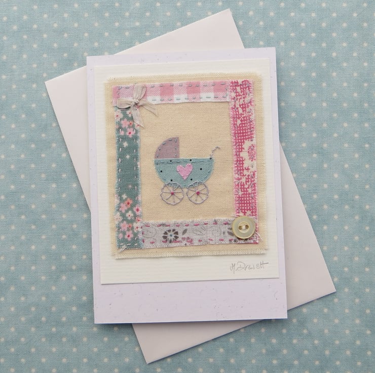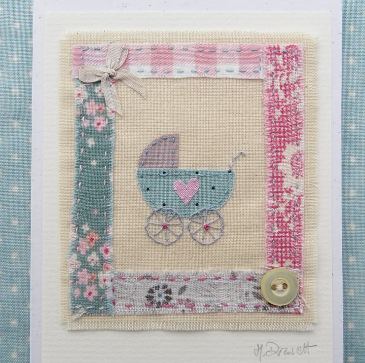 Designed to celebrate the arrival of a baby girl (or Christening) the miniature hand-stitched applique pram is bordered by pretty fabrics with a vintage mother of pearl button stitched into the design as well as a hand tied silk ribbon bow at the top. Hand embroidered details complete the miniature applique design.
