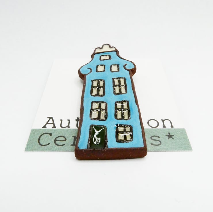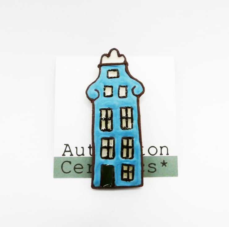 Beautiful handmade ceramic brooch in the shape of a Dutch style town house based on the type you see in Amsterdam.