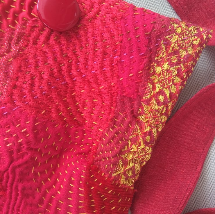 This is a one of a kind, Boro inspired red shoulder or cross body bag. A patchwork panel of recycled fabric in shades of red with gold and white was machine stitched onto a fabric backing. It was then hand embroidered using embroidery silks to bond all the fabrics together and make unique, beautiful patterns and textures.