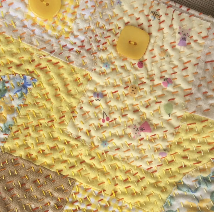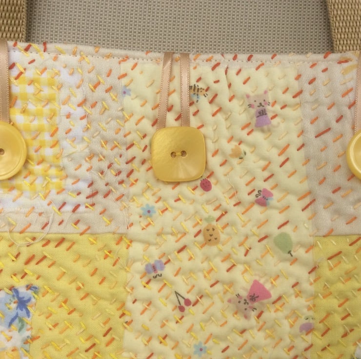 This is a one of a kind, Boro inspired handbag. The front of the bag is a patchwork panel of fabric in shades of yellow with some brown and green, machine stitched together. It was then hand embroidered using embroidery silks in shades of yellow, red and orange to bond all the fabrics together and make uniquely beautiful patterns and textures.