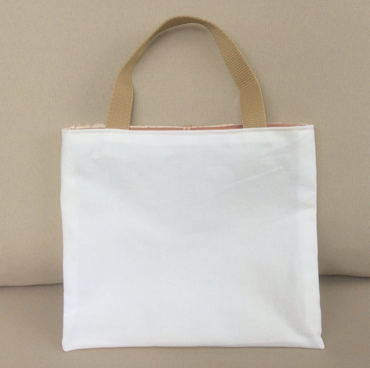 The bag has a cream fabric back and is lined with rose gold China silk. There is one internal slip pocket. There are three ribbon loops and three yellow buttons as closure for the bag. The single handle is approximately 32cm long.