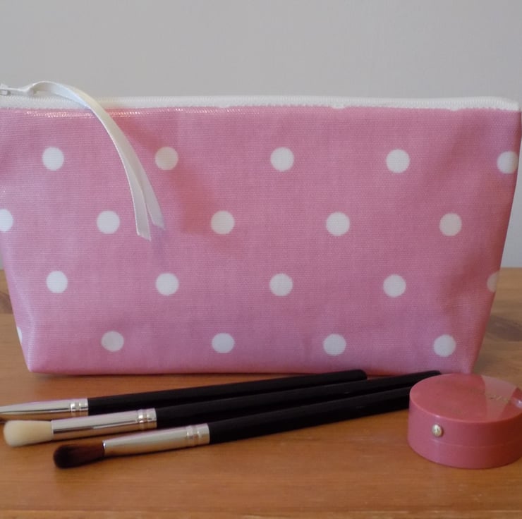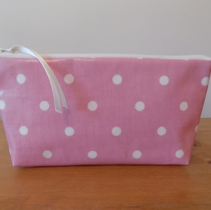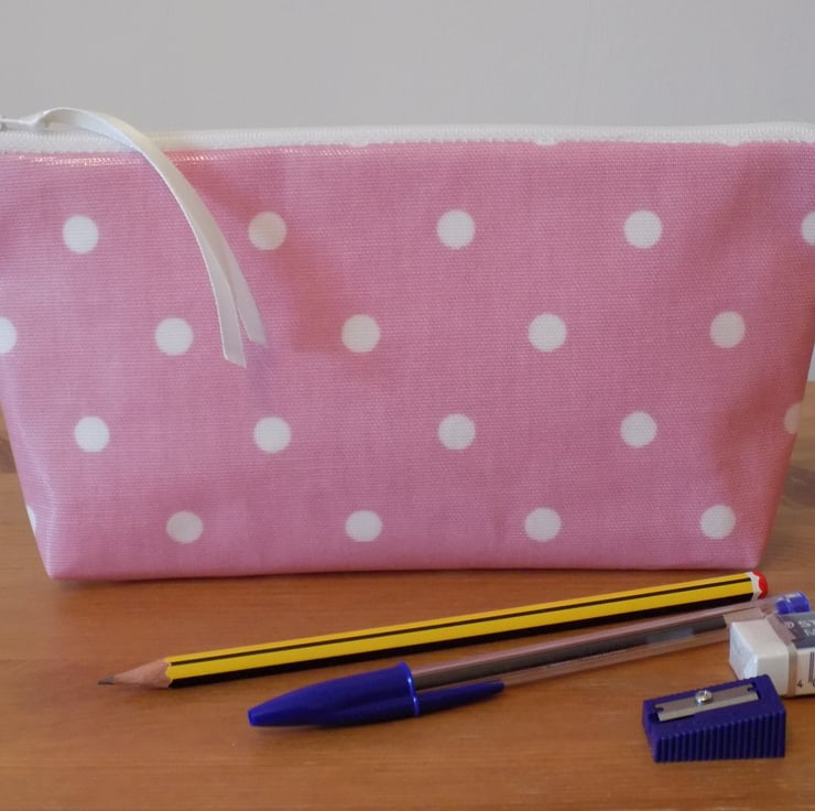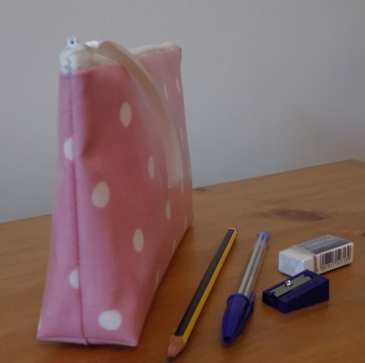 This pink & white polka dot triangular oil cloth pencil case, which could also be used as a make up bag, would make an ideal gift for the scholar in your life!