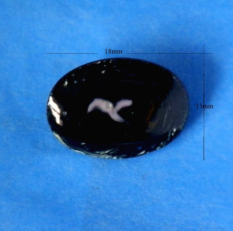 The brooch measures 18mm by 12mm. It is mounted on a simple catch, soldered to the copper base.