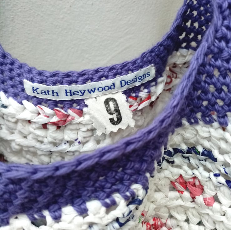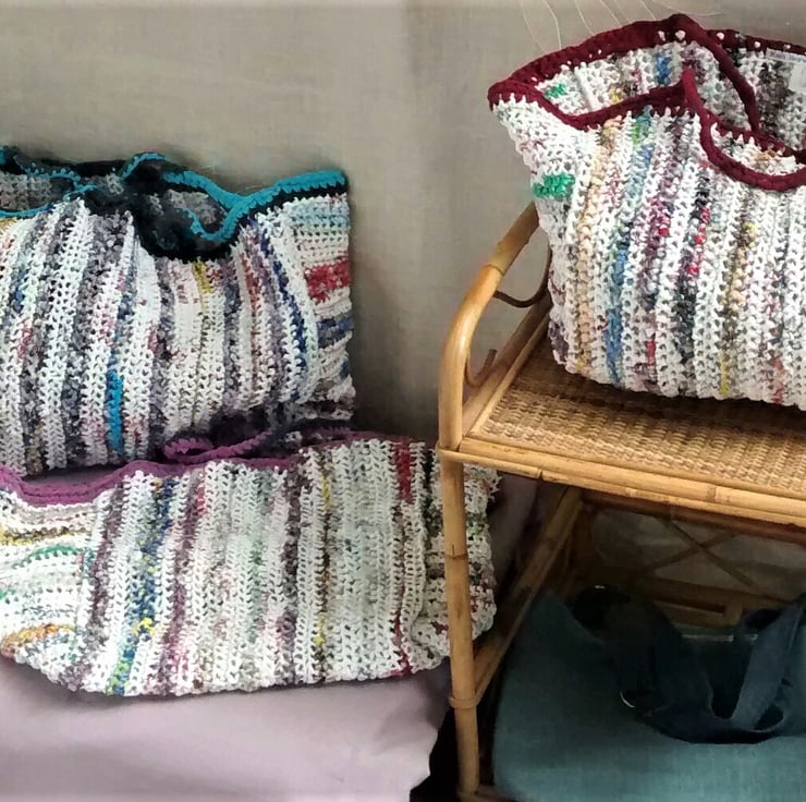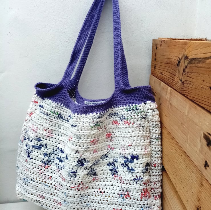 I have made the plastic yarn by cutting up discarded plastic bags and crocheted the ribbons of plastic into a strong bag. A cotton yarn has been used to create handles for the bag which is comfy to carry.