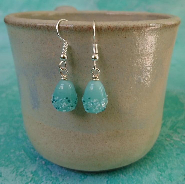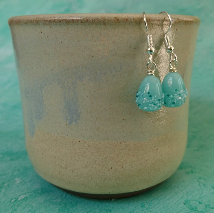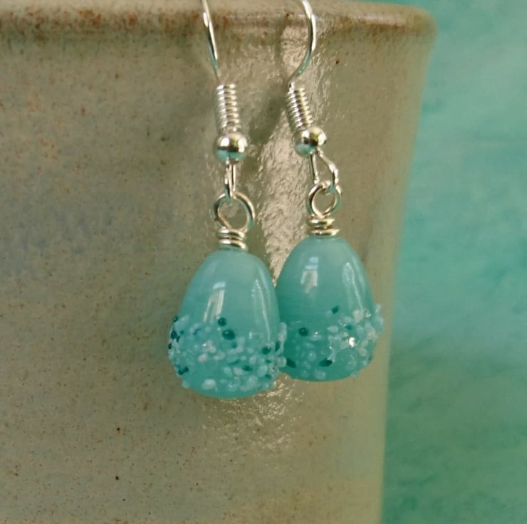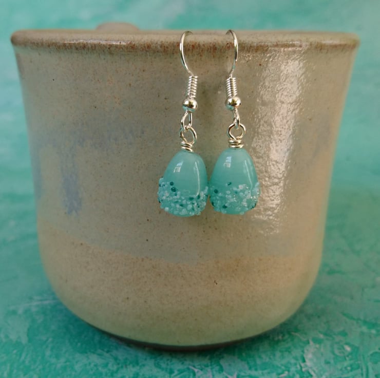 These simple earrings have been made with beautiful, glass lamp work beads in a drop shape. They have a cool mint base with a raised decoration in teal, white and aqua. The ear wires are silver plated.