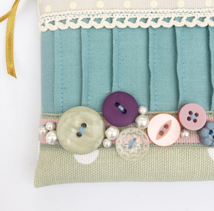 Handmade dotty coin purse embellished with vintage buttons, spotty and striped ribbons and fabric trim.