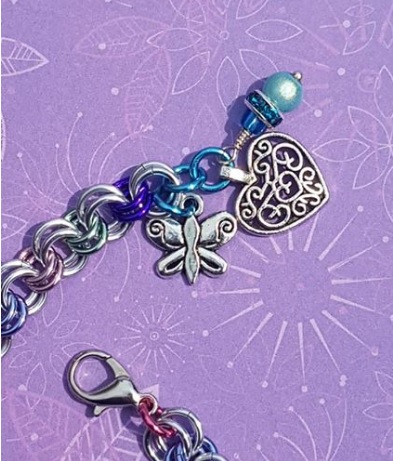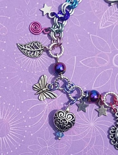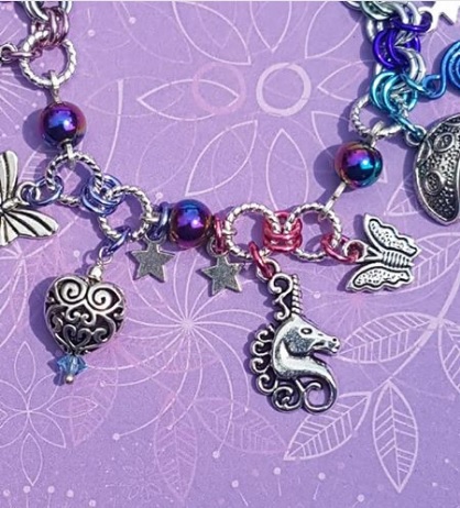 Gorgeous vibrant colours and lovely Tibetan Silver charms. Great for those who love Unicorns and mythical creatures. The unicorn head charm has a gorgeous filigree puffed heart next to it, and butterfly and forest charms and silver stars. Links are a mix of silver plated and anodised aluminium rings in various bright colours.