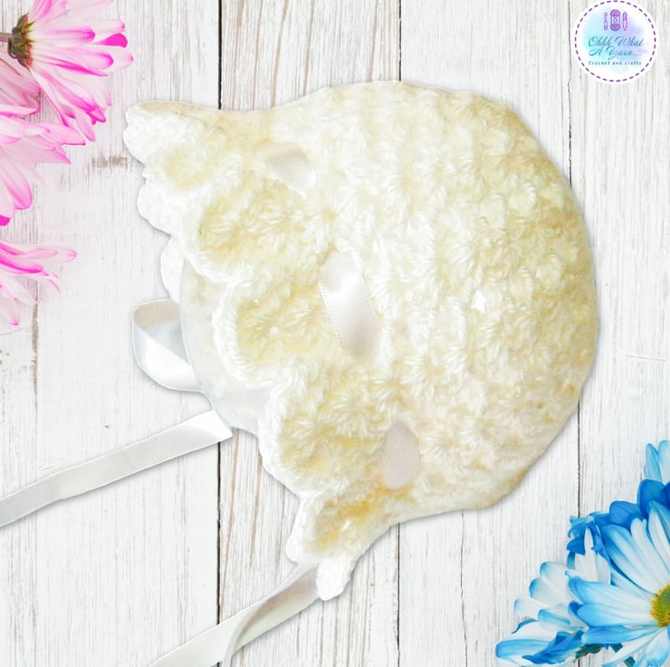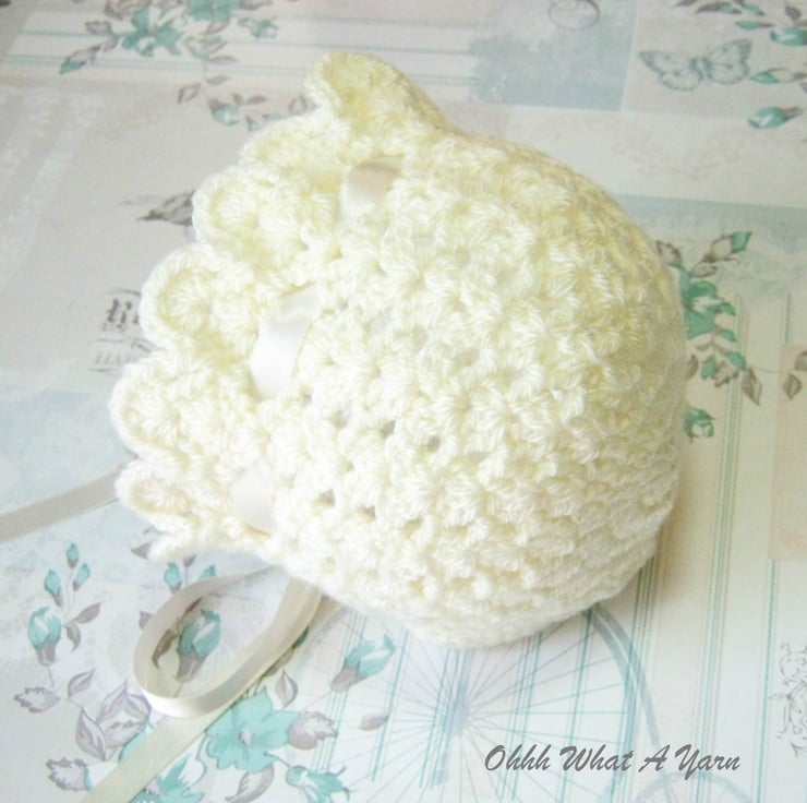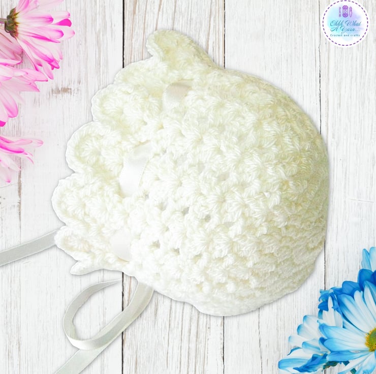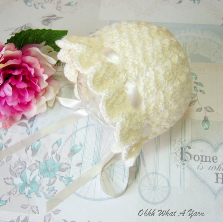 The beautiful bonnet is created from a traditional vintage bonnet pattern and has a lovely lacy pattern with a scalloped edge. It also has a lovely satin ribbon detail for fastening .