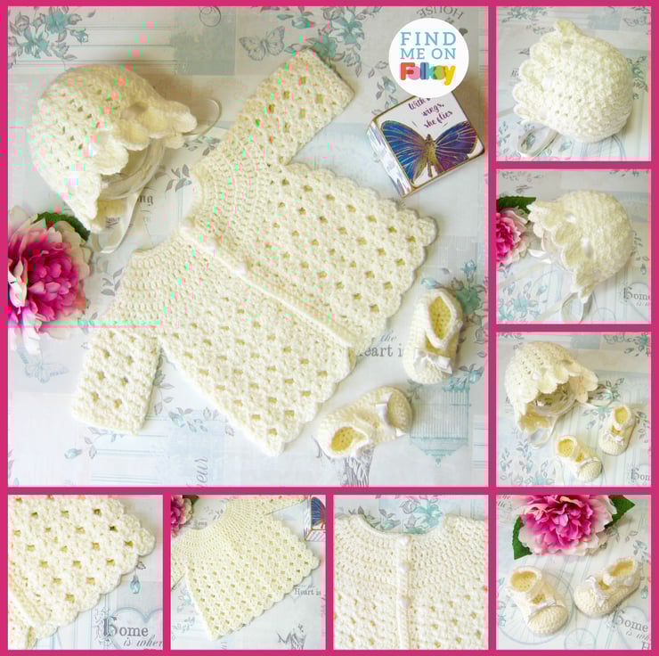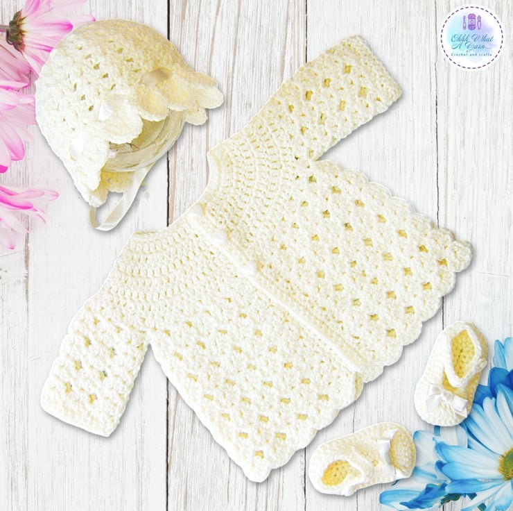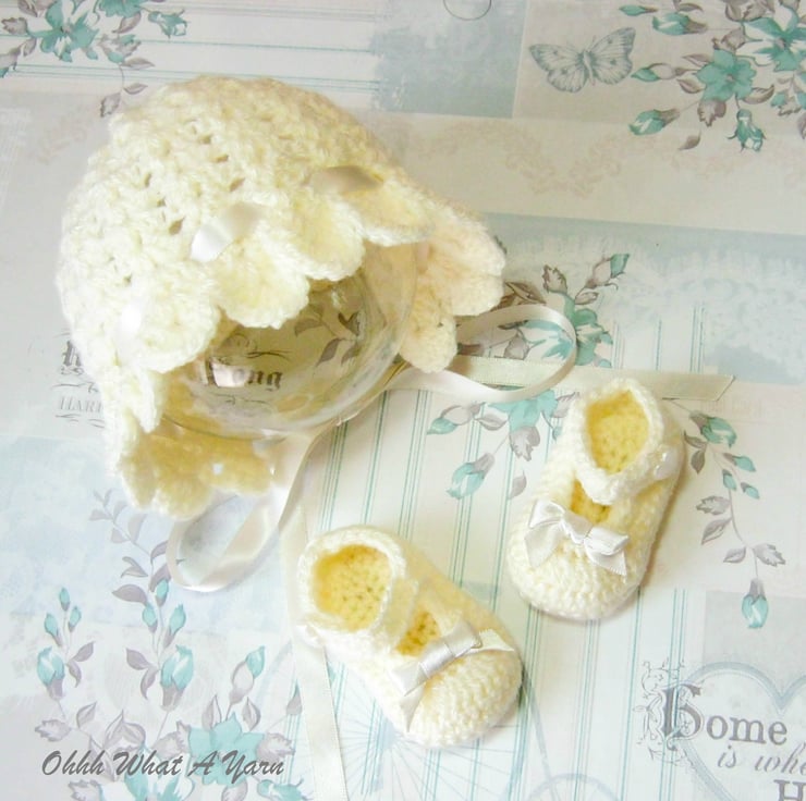 This pretty cream traditional coat bonnet and shoes set is crocheted in 100% acrylic yarns.