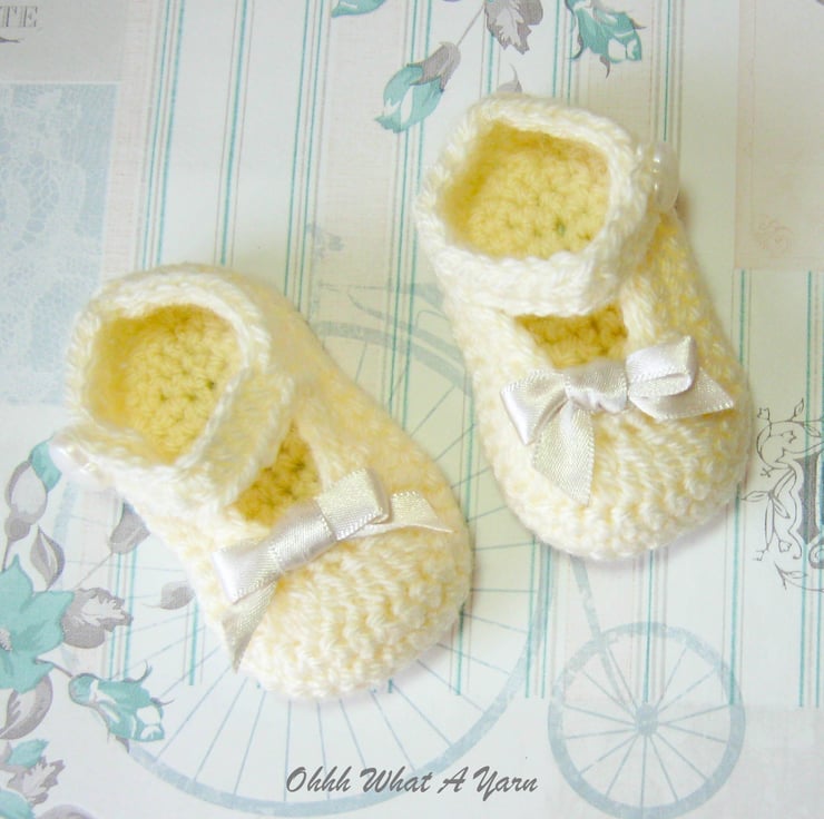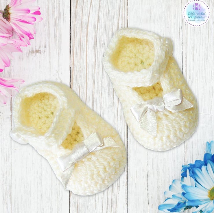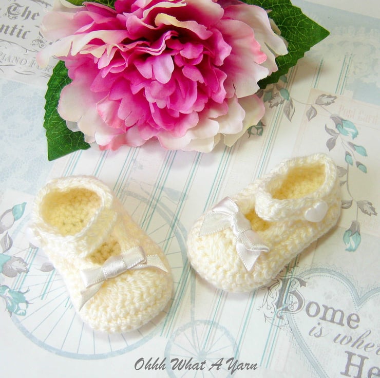 The little cream shoes are decorated with handmade ribbon bows and they have a cream pearl heart button to fasten the straps.