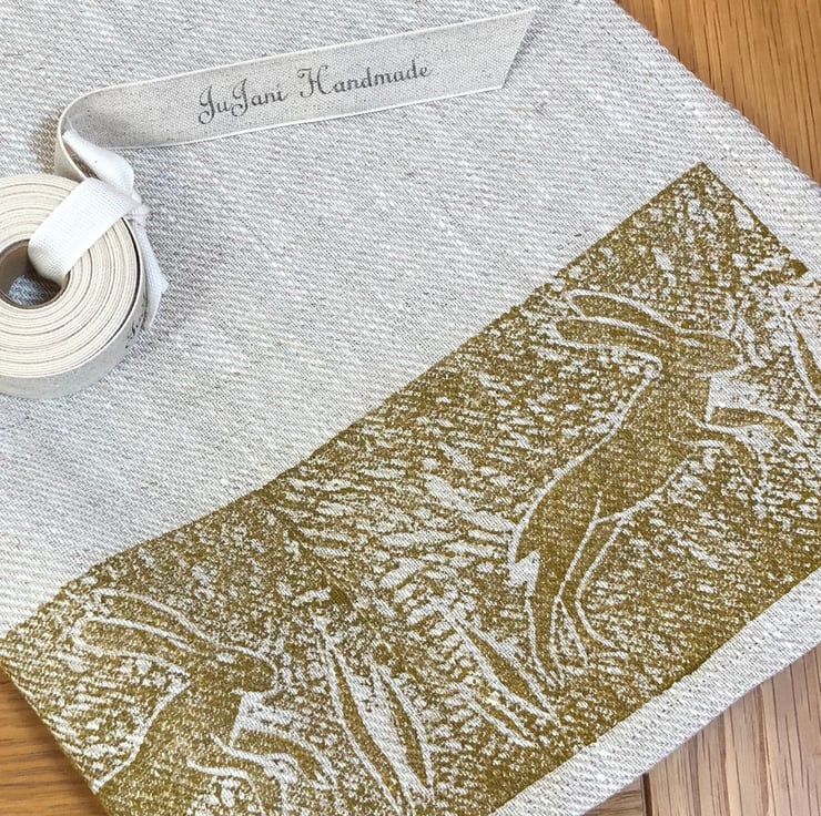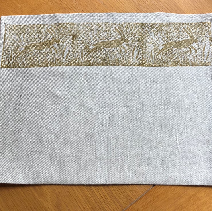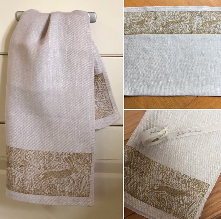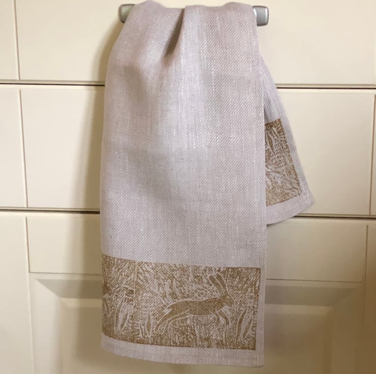 This country kitchen style tea towel has been made from a quality linen fabric and then hand printed using a Lino block carved by myself depicting a beautiful leaping hare.