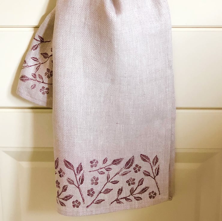 This country kitchen style tea towel has been made from a quality linen fabric and then hand printed using a lino block carved by myself depicting beautiful trailing jasmine.