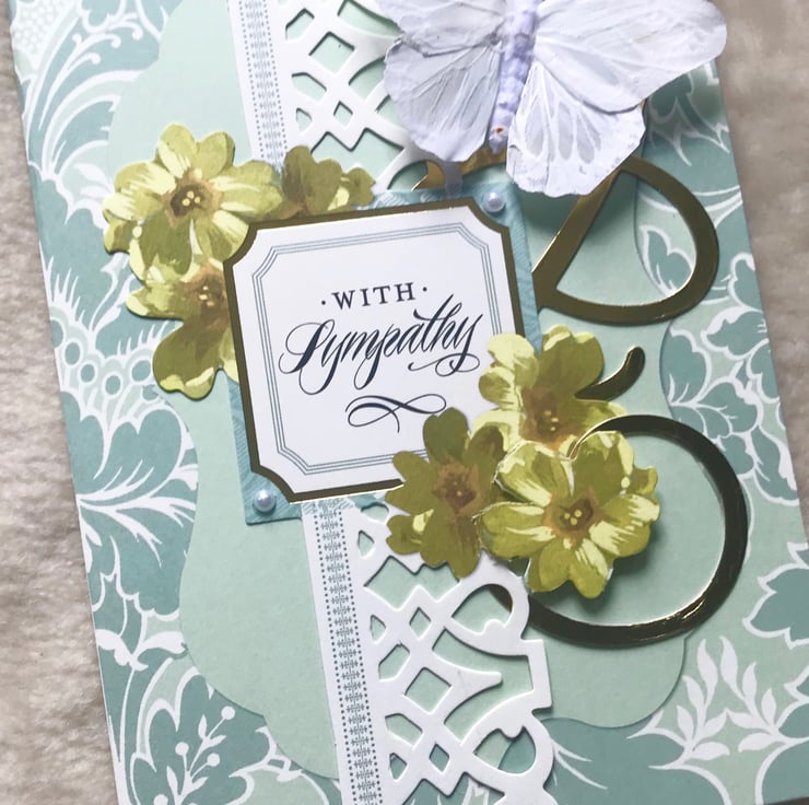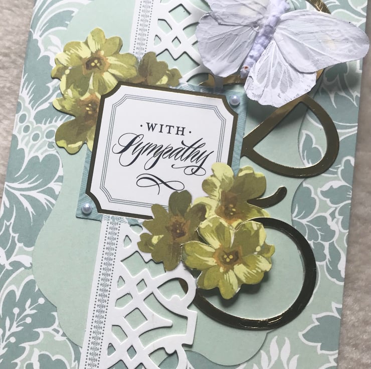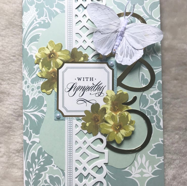 An elegant 3D effect, collaged sympathy card, handmade with Anna Griffin designer card stock. Embellished with co-ordinating, die-cut ephemera, and feather butterfly. Approx. 5"x7" in size, and inside includes the sentiment, 'Thinking of You'.