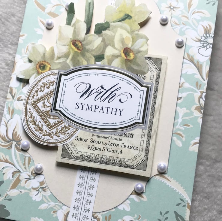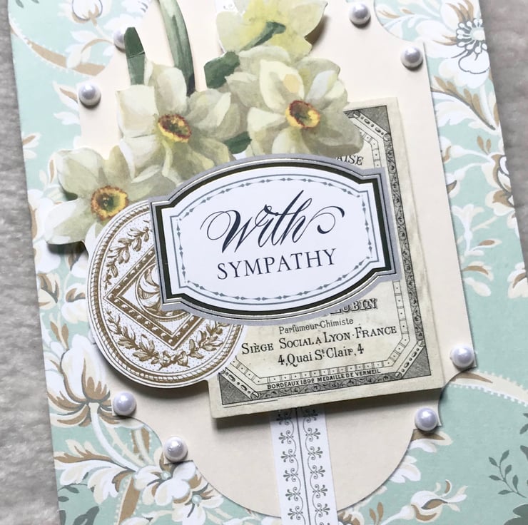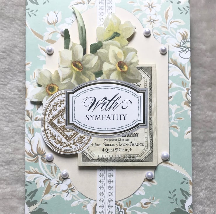 An elegant 3D effect, collaged sympathy card, handmade with Anna Griffin designer card stock. Embellished with co-ordinating, die-cut ephemera, and faux pearls. Approx. 5"x7" in size, and inside includes the sentiment, 'With Deepest Sympathy'.