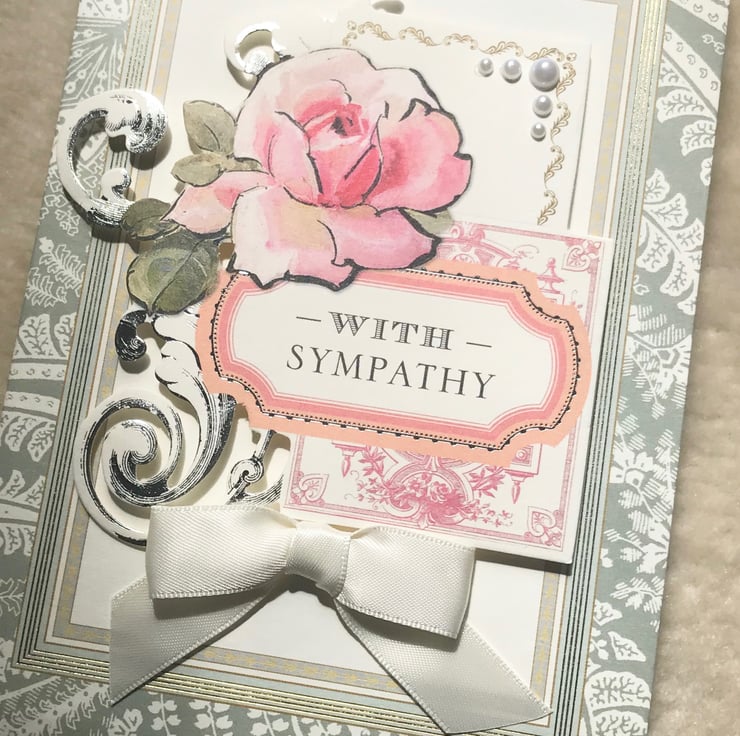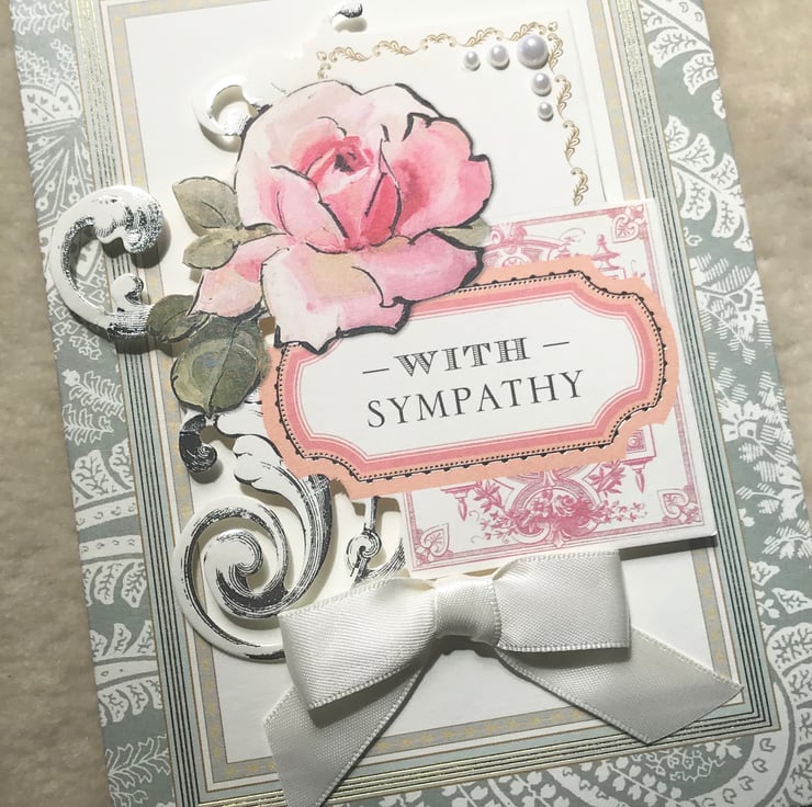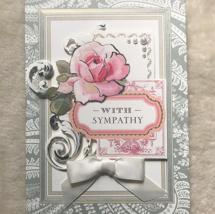 An elegant 3D effect, collaged sympathy card, handmade with Anna Griffin designer card stock. Embellished with co-ordinating, die-cut ephemera, with silver foiling, faux pearls, and satin bow, Approx. 5"x7" in size, and inside includes the sentiment, 'In Sympathy'.
