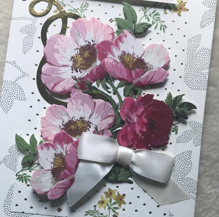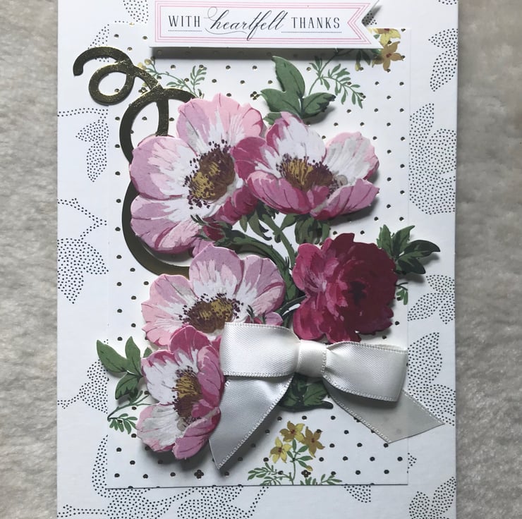 An elegant, floral 3D effect, collaged Thank You card, handmade with Anna Griffin designer card stock. Embellished with co-ordinating, die-cut ephemera, with gold foiling, and satin bow. Approx. 5"x7" in size, and inside includes the sentiment, 'Thank you from the bottom of my heart'.
