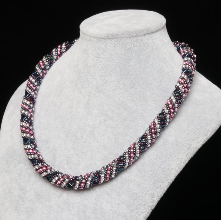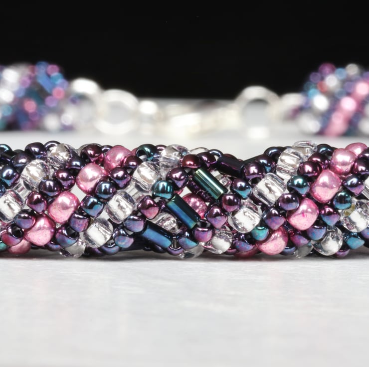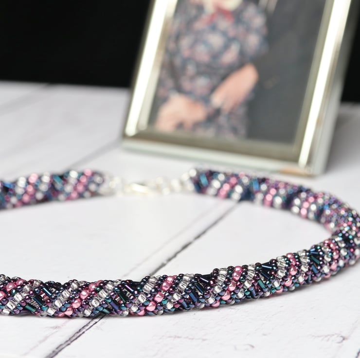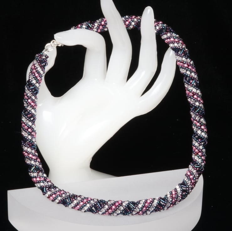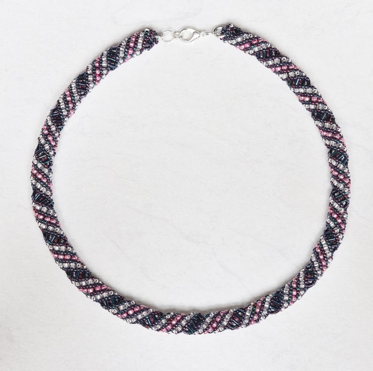 This elegant necklace is made from metallic pink, silver-lined crystal and dark purple iris coloured seed beads with matching purple iris 3mm bugle beads. Purple iris is a beautiful iridescent deep plum colour with overtones of dark green and purple. The pattern I have used is called a Russian Spiral. It makes a hollow, and therefore lightweight, necklace.