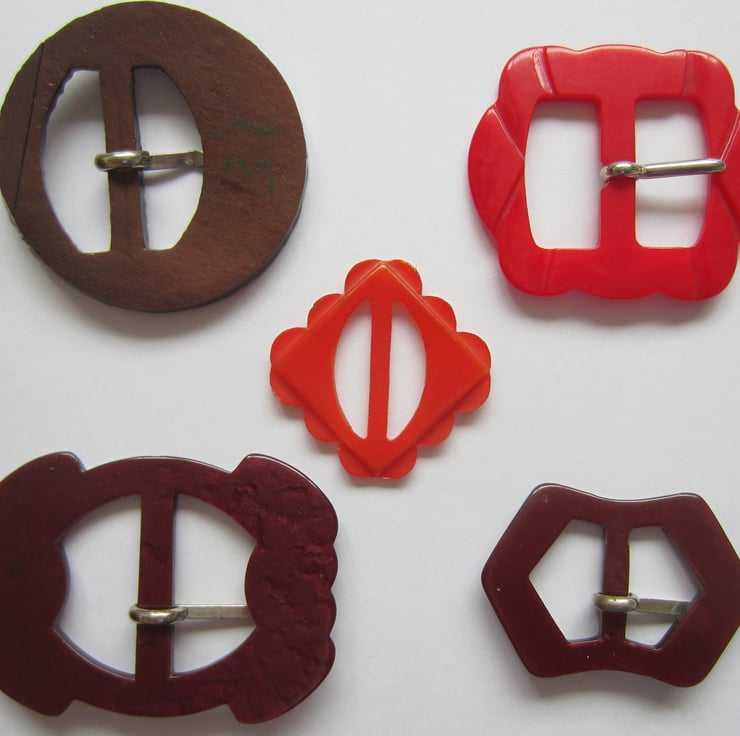 Selection of 5 vintage plastic buckles in colours of orange, red, burgundy and brown.