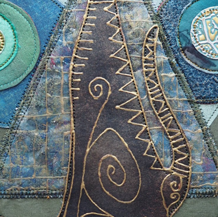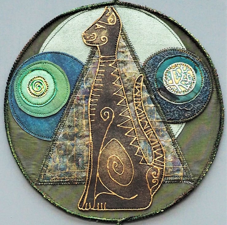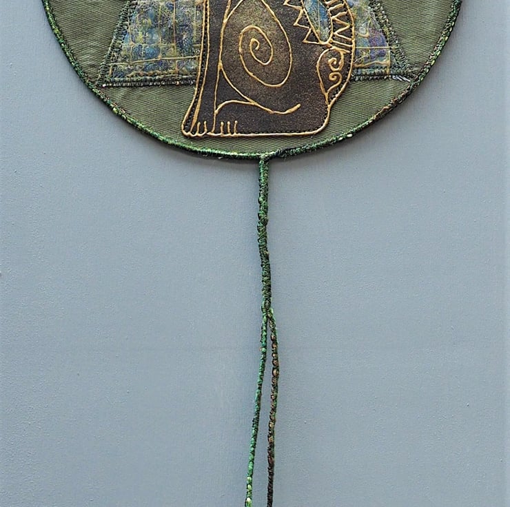 Bast Cat Mandala - 20cm (8") round plus yarn hanging loop, edging and danglers with handmade, painted paper beads - (Overall length approx 70cm). I printed the cat design onto fabric with lino then painted it with fabric paints,outlined it in gold, then stitched in place. The background is an olive green silk lining fabric (stiffened on the back to hold it's shape). The background depicts a pyramid made of sandwiched fabric scraps and painted bondaweb in organza, The moon-rise and setting sun detail is embossed metal (softened drinks can). The circular mid backgrounds are various painted fabrics. Everything is secured in place with machine stitching. The mixed yarns are added to tone or compliment the finished piece