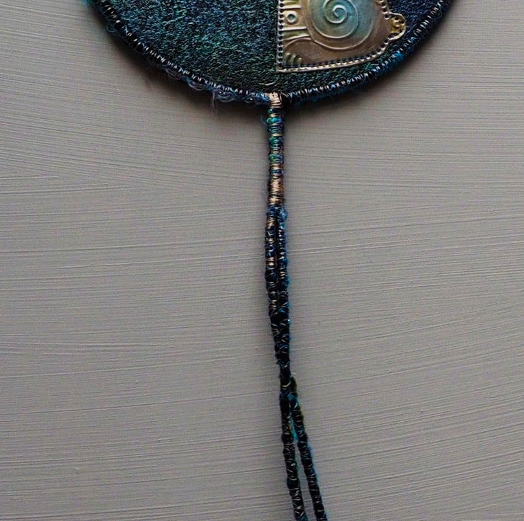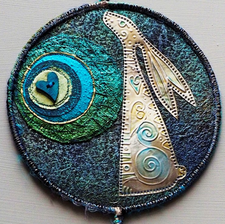 Embossed metal hare (from drinks cans) with painted fabric background. Features a heart shaped buttonon a moon with painted silk and handmade paper roundel. Edged with yarn and pewter colour metallic machine stitching. The back is plain black and stiffened to hold it's shape.