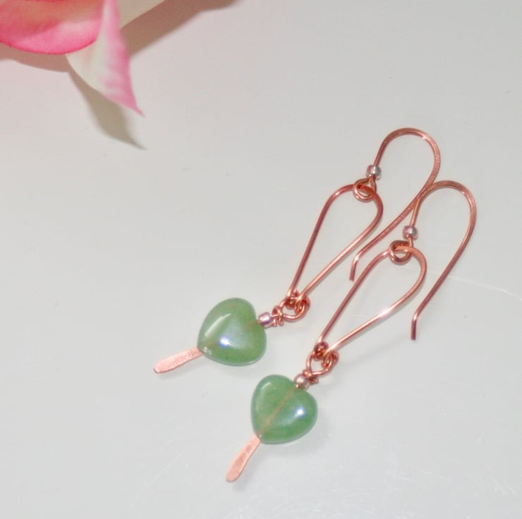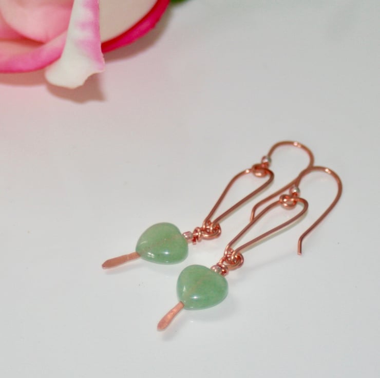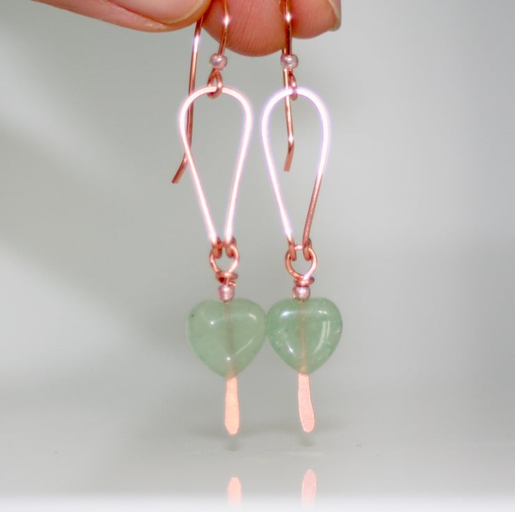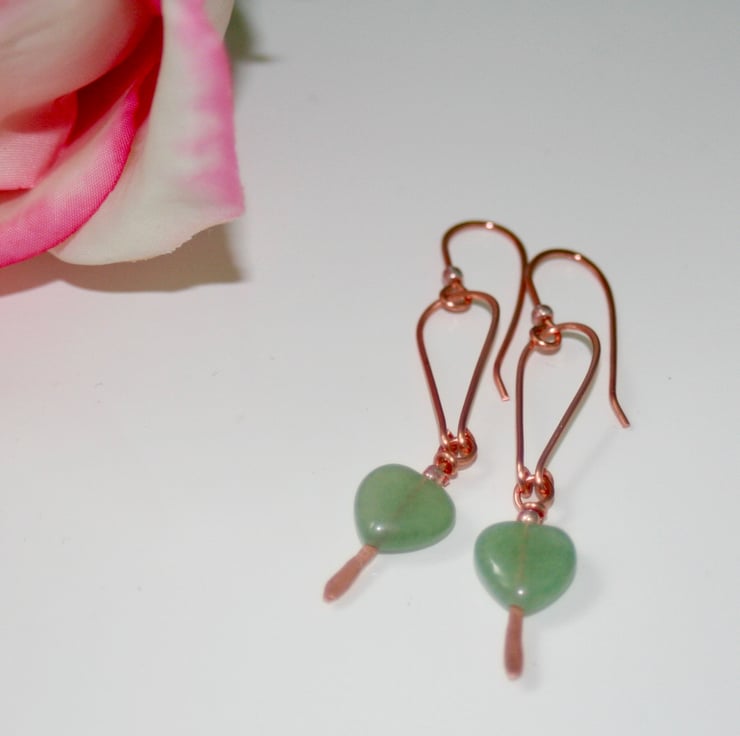 Pretty green aventurine hearts hang from hand-shaped and hammered bare copper arches.