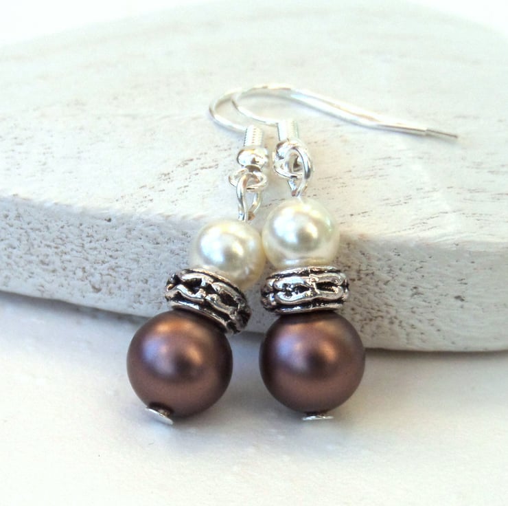 A lovely pair of earrings, contrasting 8 mm soft brown Swarovski® crystal pearls with smaller ivory crystal pearls. The earrings hang from silver plated earwires.
