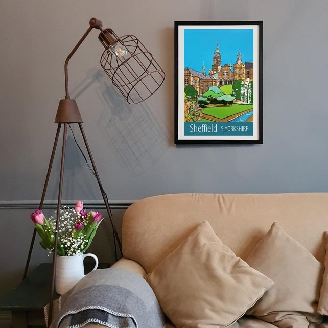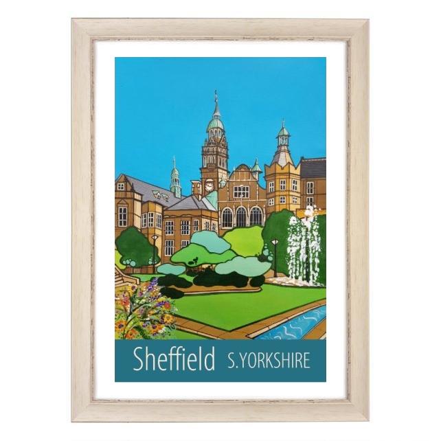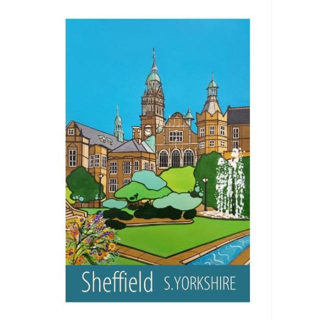 A contemporary travel poster style print of Sheffield's Town Hall and Peace Gardens, from my own original acrylic painting.