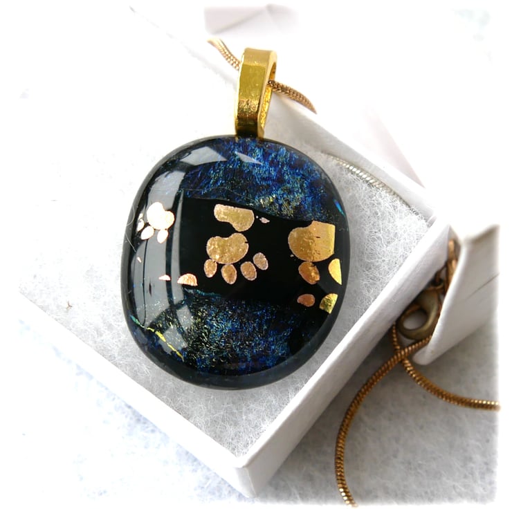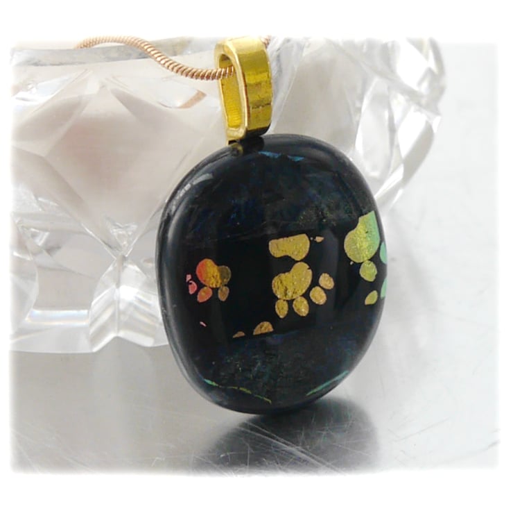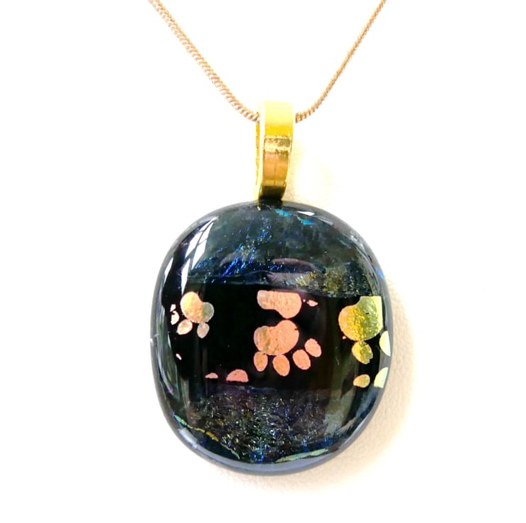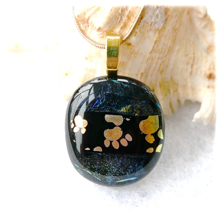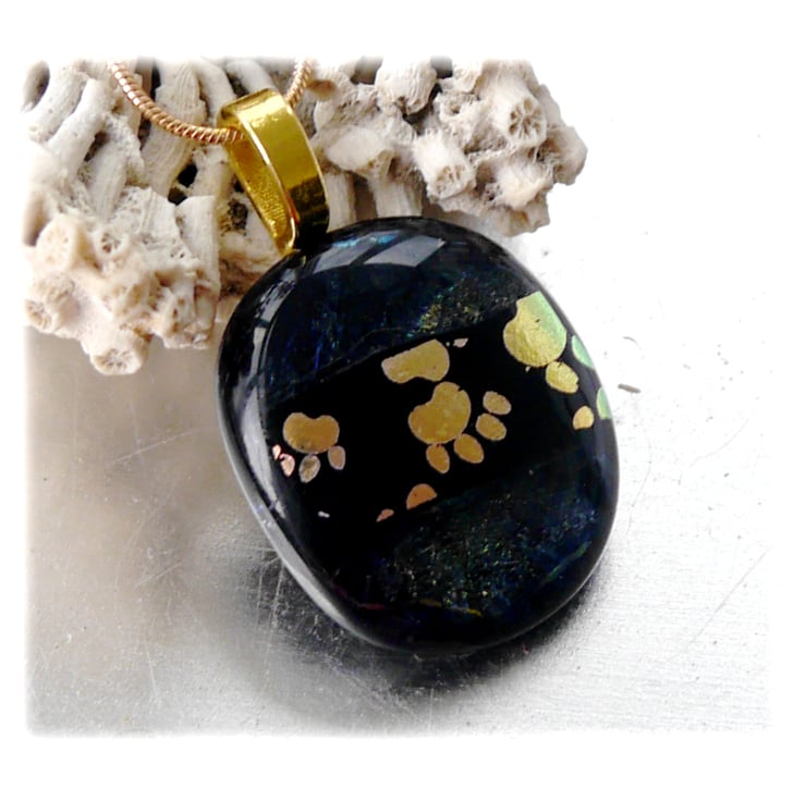 Dichroic Glass Pendant 127 Paw Prints Black Handmade and gold plated chain
