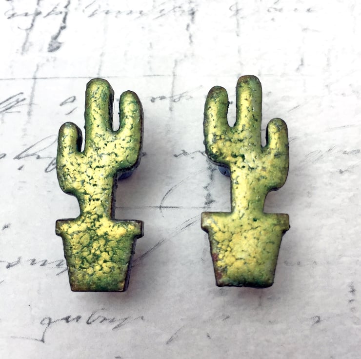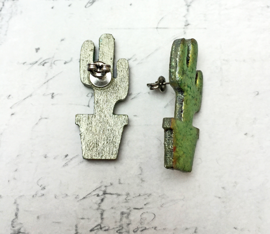 I have hand painted the back of the earrings with sage green metallic acrylic paint. The cactus is approximately 4cm long by 1cm wide, and I've used surgical steel silver plated ear posts with rubber ear nuts (if you prefer surgical steel scroll backs, please let me know in the notes section).