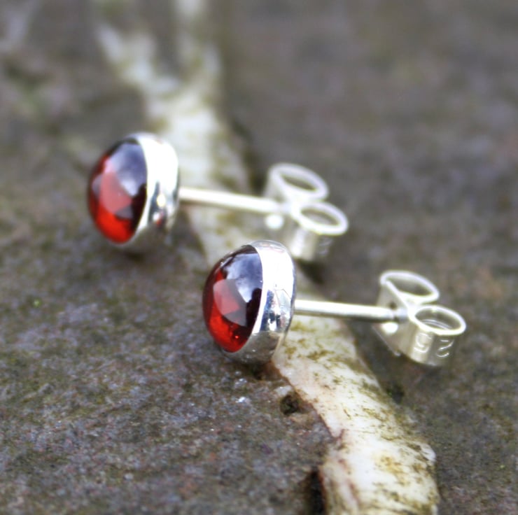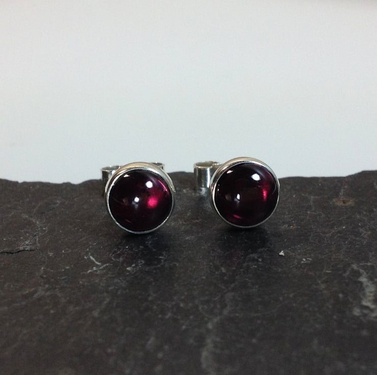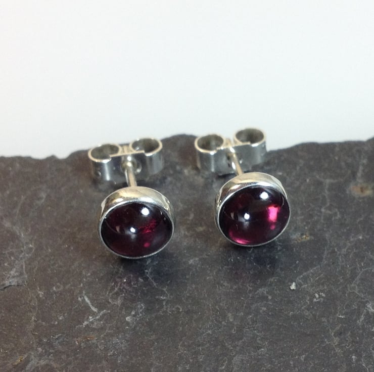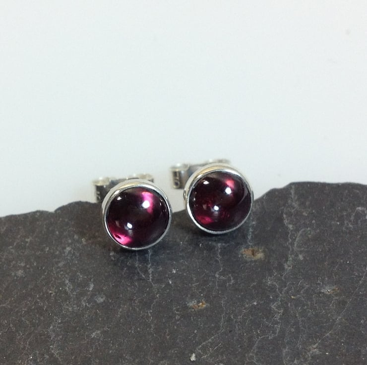Simple small sterling silver stud earrings set with pinky red garnet cabochons.
