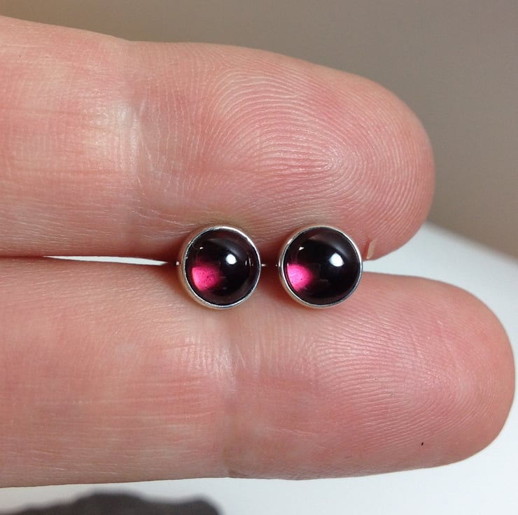The rhodolite garnet cabs measure 6mm diameter. The silver has been polished to a bright finish.