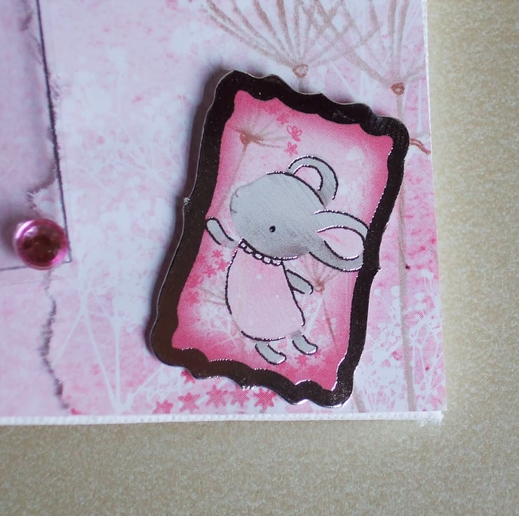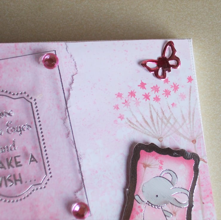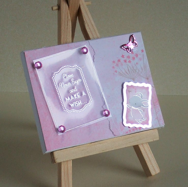 The canvas has been covered with 2 coordinating pieces of satin finish paper, one is a dappled pink and the other is dappled in paler pink with flower heads on it. There is a piece of foiled acetate with the sentiment "Close Your Eyes And Make A Wish" in silver foil,this has been raised slightly from the canvas and has pink faux gems at each corner. In the bottom right corner is a miniature picture of a cute mouse in a pink dress which is framed with silver foiling. A tiny die-cut butterfly decorates the top corner.