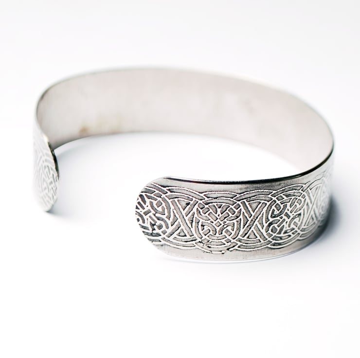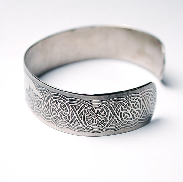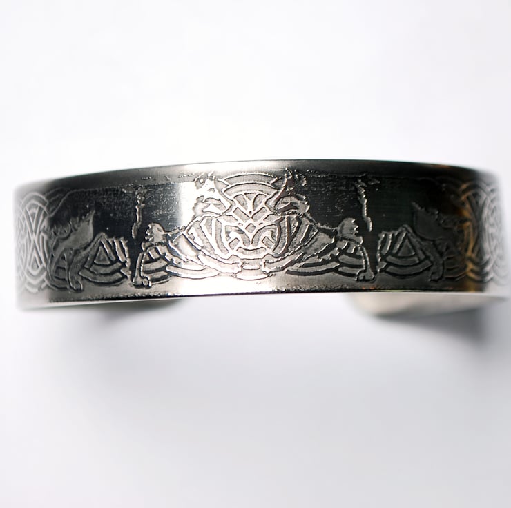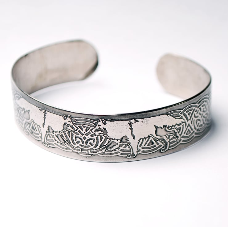 A stunning wolf and Celtic knot motif cuff comprised of two wolves facing each other on an interwoven celtic knotwork design. Beautifully etched and inspired by Viking and Celtic mythology. This design is completely unique and was born from a series of hand drawn sketches then refined through digital technologies.