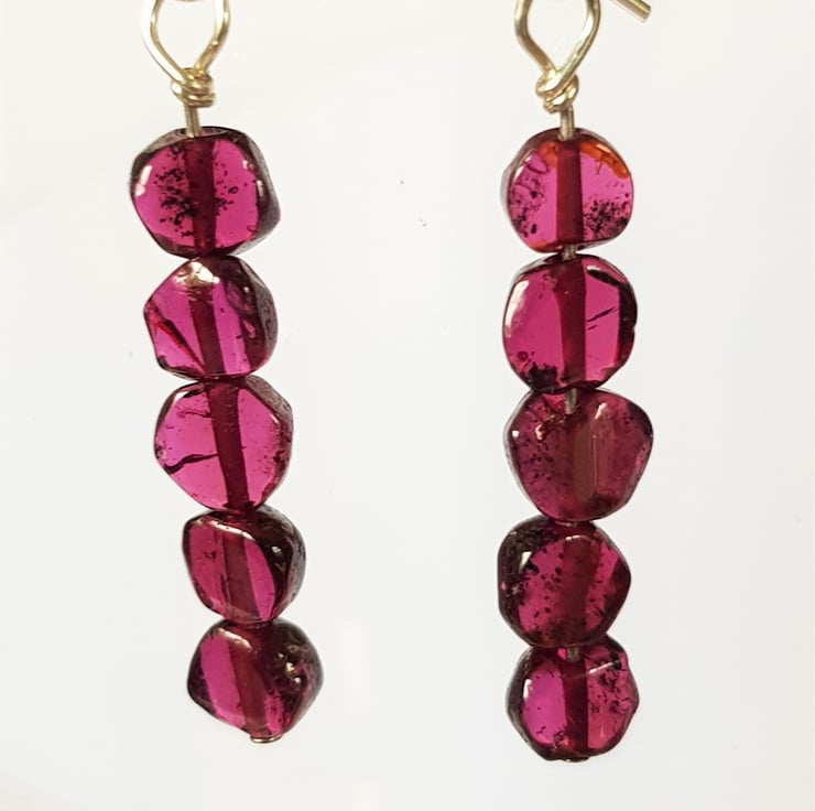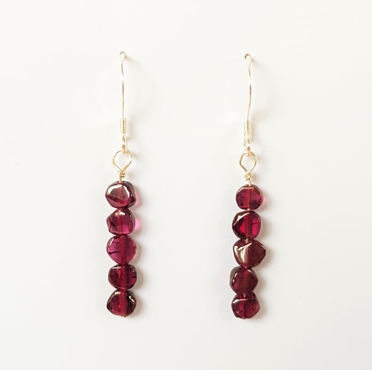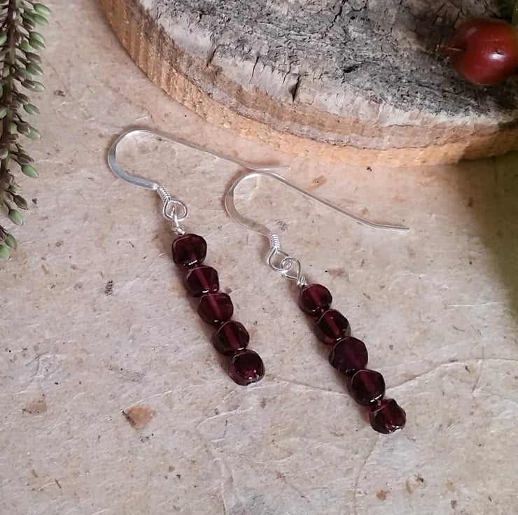 These beautiful drop earrings feature fabulous flat garnet beads hanging from sterling silver earwires.