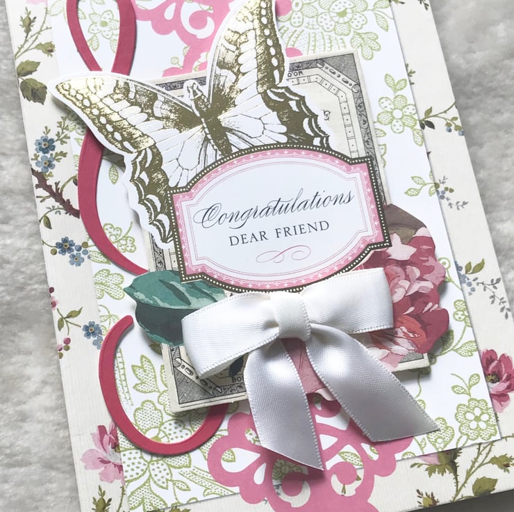 An elegant 3D effect, collaged congratulations card, handmade with Anna Griffin designer card stock. Embellished with co-ordinating, die-cut ephemera, with gold foiling, sequin, and satin bow. Approx. 5"x7" in size, and inside includes the sentiment, 'Congratulations'.