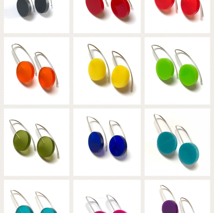 Acrylic and silver earrings. Circle is 16mm and total length/drop is approximately 30mm. Perfect if you need a splash of colour to your outfit.
