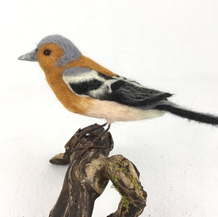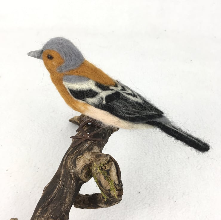 This needle felted chaffinch is one of a series of british garden birds available in my shop. The chaffinch has been needle felted using 100% woollen fibres and a barbed felting needle that is used to sculpt the wool into shape whilst felting it. Merino wool in appropriate colours has been used to create the markings. The bird has wired feet and beaded eyes and the beak has had a light covering of wax.