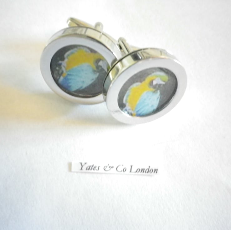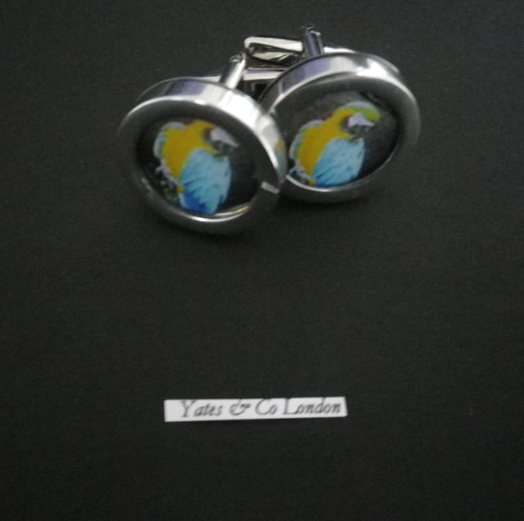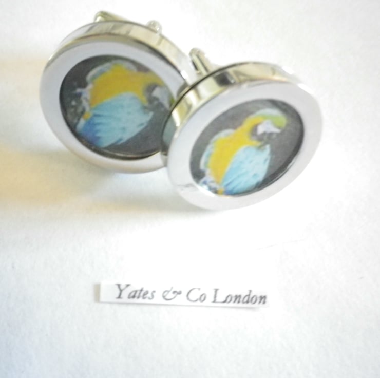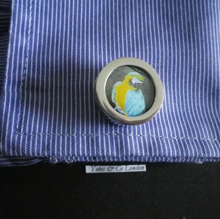 Part of an edited collection of exceptional images we have made available on high quality cufflinks......they include dramatic images of animals and birds, plus beautiful classic and contemporary artwork and have an even, smooth, highly polished silver finish, with a deep setting and a swivel action 'cigar' shaped shank for ease of use. Crafted from rhodium plated alloy the image has a 15mm ( 3/5" ) protective transparent film, with a neat presentation box....