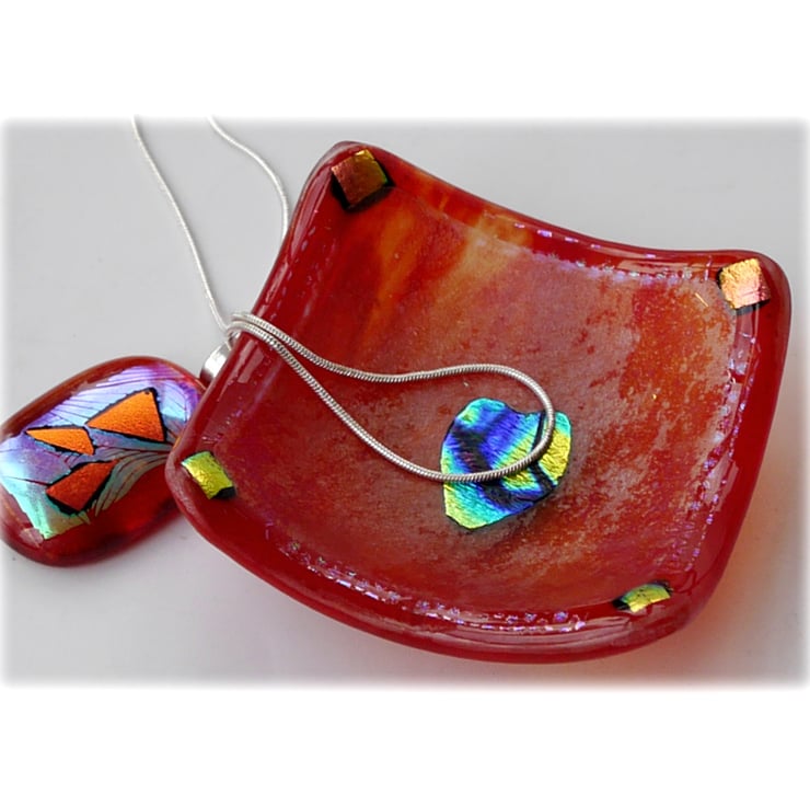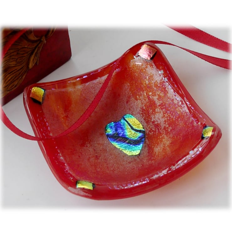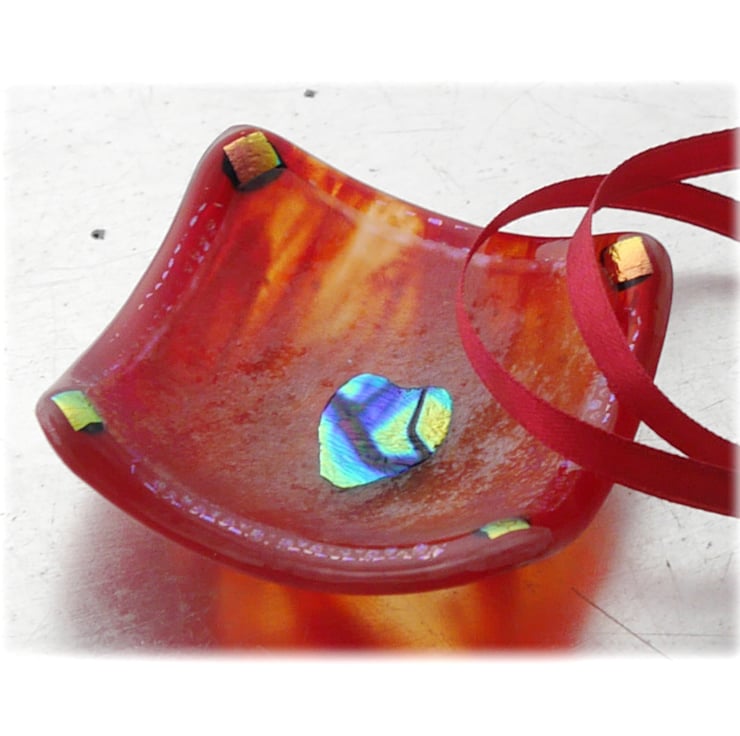 This little dish is cut from clear streaky red glass and a layer on top of clear iridescent. It is bordered by a very pretty clear dichroic glass. In the centre I've added a Dichroic glass heart which is fused into place to become one with the dish and more little snips of the same glass in the corners of the dish.