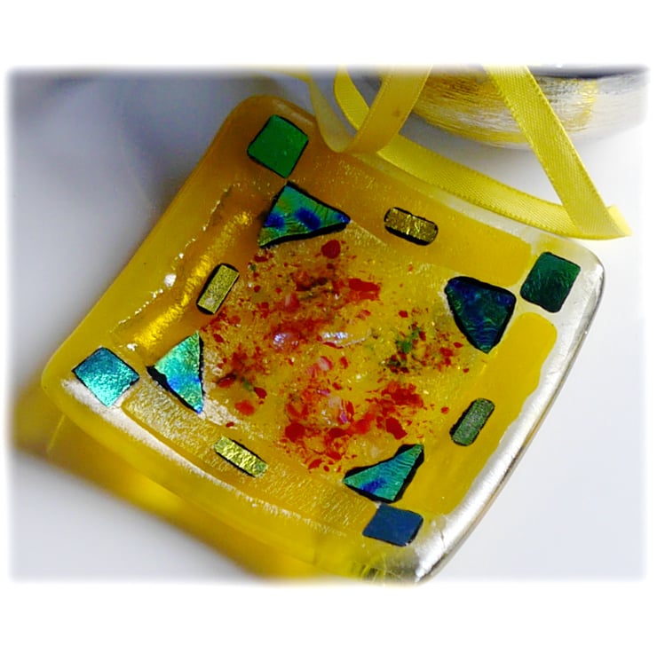 This little dish is ornately decorated. The centre is scattered with pretty frit including shimmery dichroic, the edges, bordered with an iridescent yellow are topped with gold and emerald dichroic accents.. I've also added some decorated dichroic triangles in the corners.