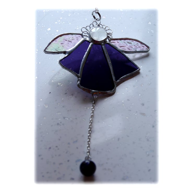 This is a stained glass suncatcher, an angel, made using the Tiffany copper foil technique.