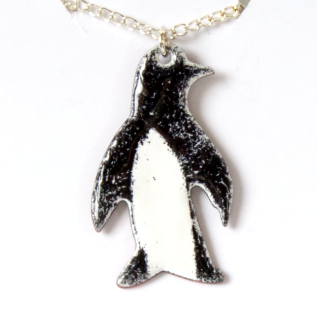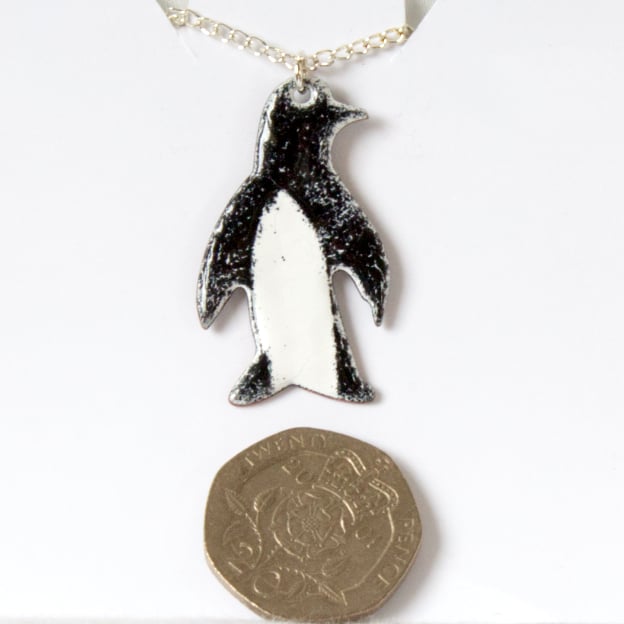 The penguin measures 33mm by 19mm. I have mounted it on a 45cm, silver plate, curb chain that fastens with a simple bolt ring.