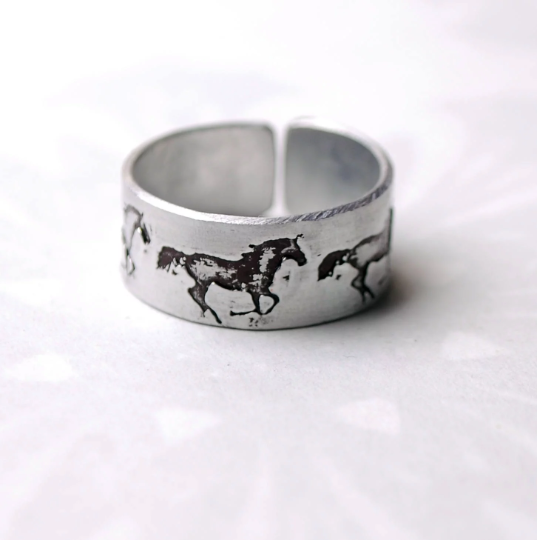 Evocative silver aluminium adjustable ring with horse design, available in a natural or an antique effect.