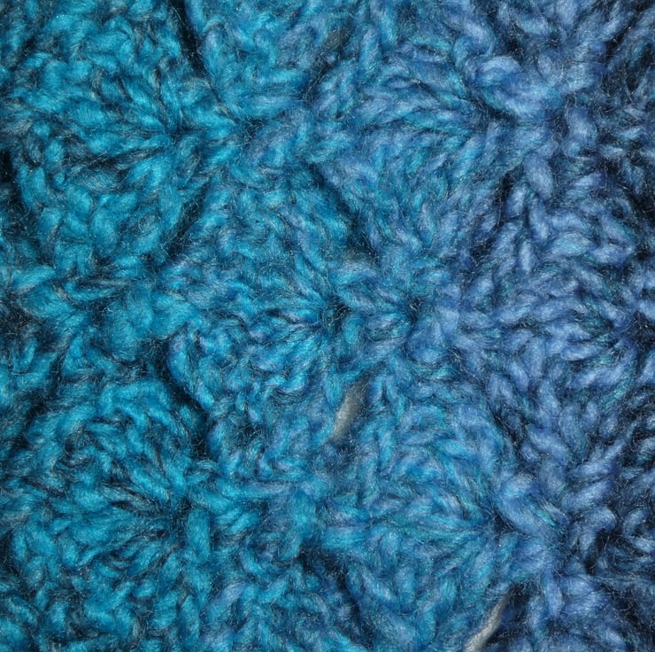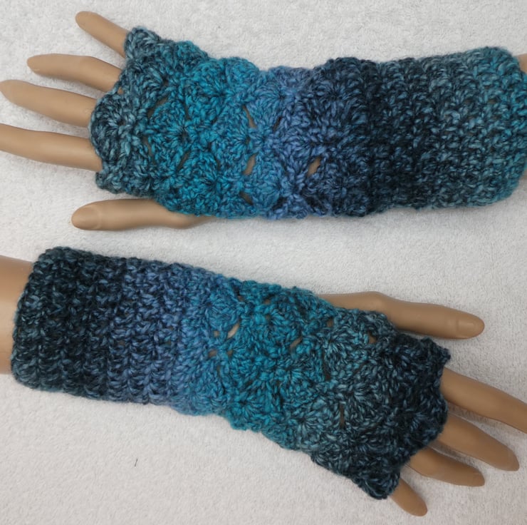 I have created these fabulous fingerless gloves from a double knit weight acrylic yarn. I have used trebles for the cuff and a fan pattern for the body of the glove, with a thumb hole on one side .