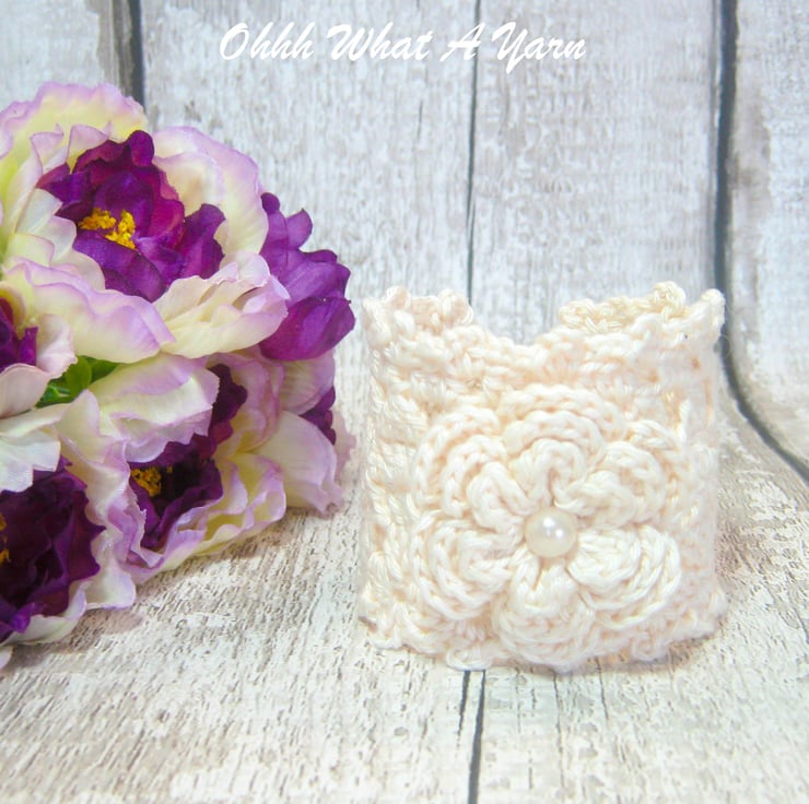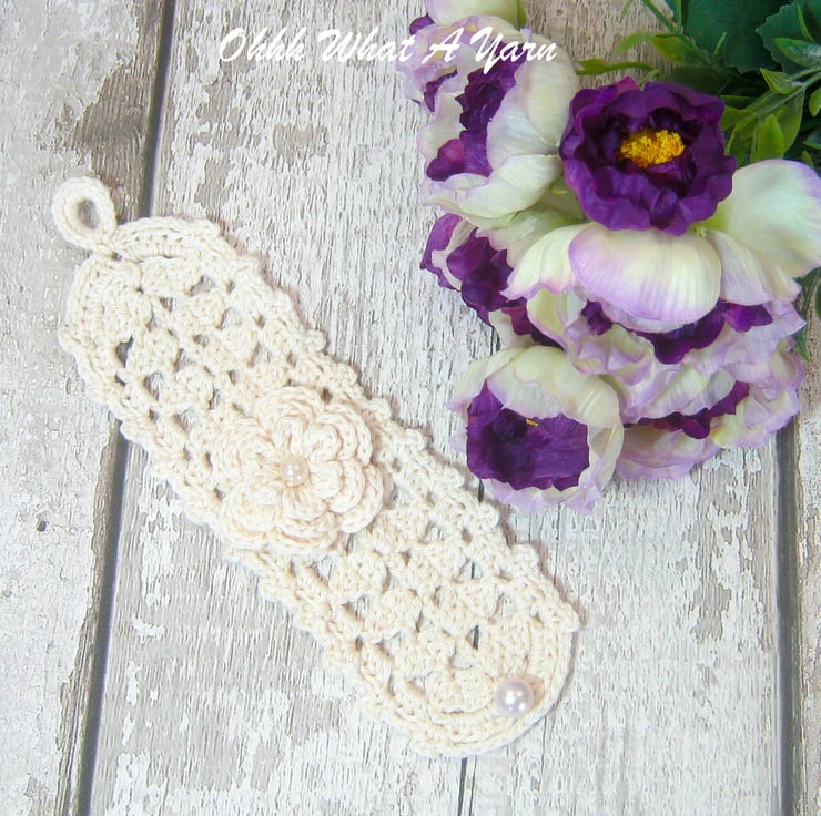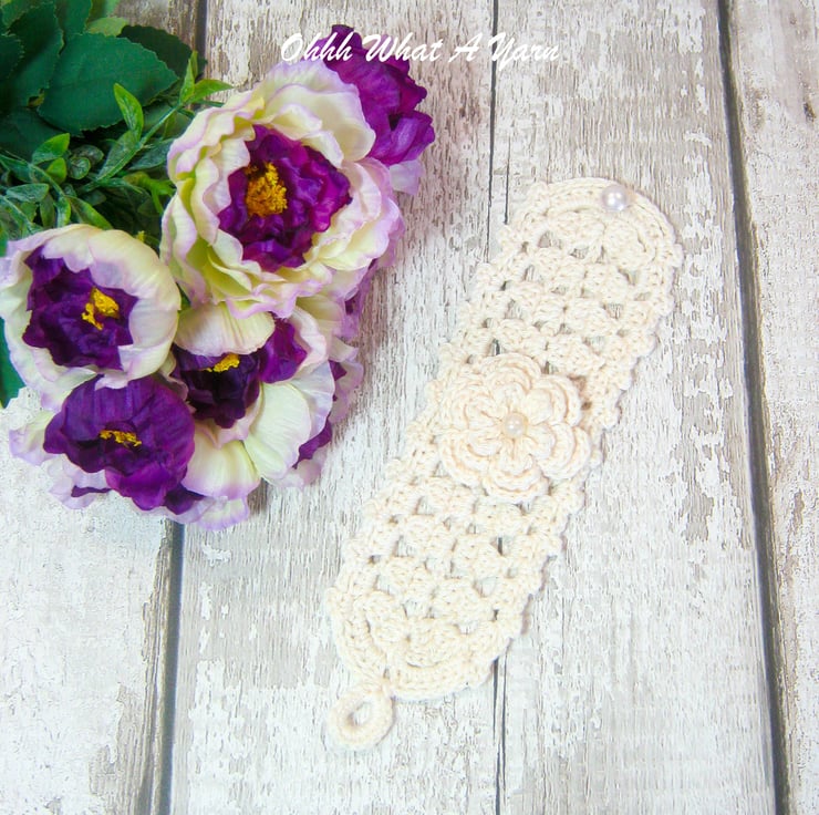 It has a decorative crochet triple flower with a cream pearl beaded centre. The bracelet itself has a lovely open lace pattern and has picots all around the edge.