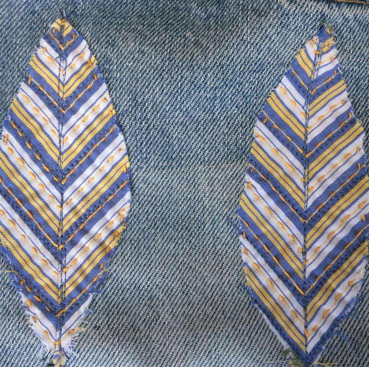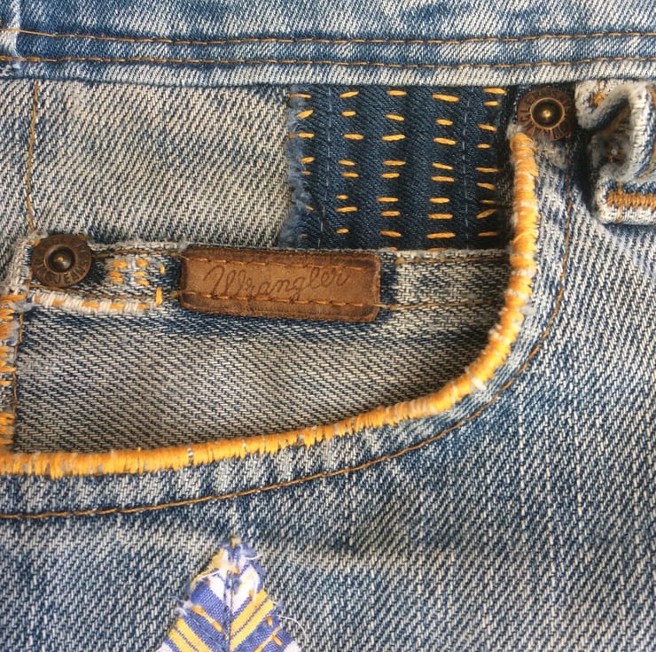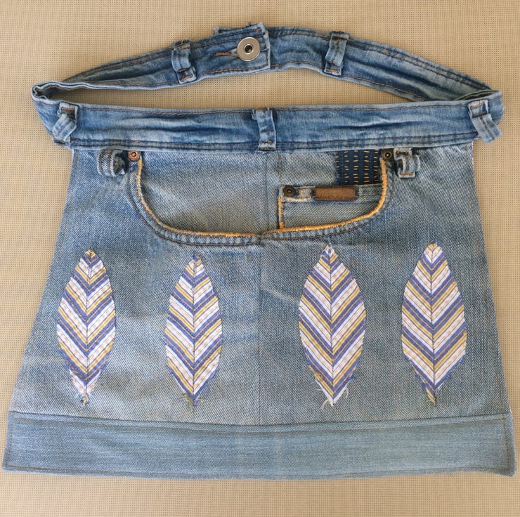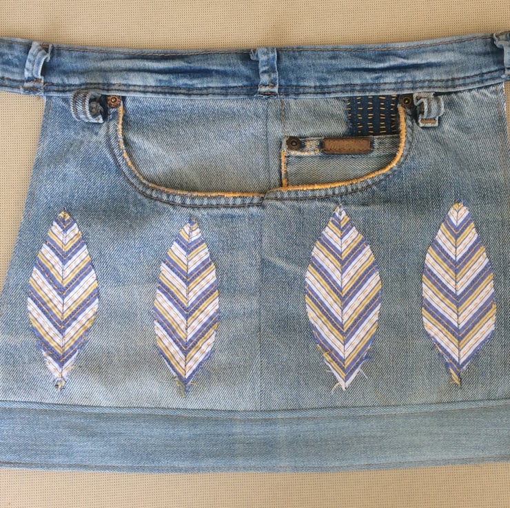 This one of a kind, repurposed denim apron with one large and one small pocket would be ideal for a gardener, crafter, artist or a bbq The well loved, freshly washed denim comes mainly from a pair of Wrangler jeans and has been decoratively patched and mended by hand with embroidery thread that matches the original stitching on the jeans. The apron is also decorated with four fabric appliqué feathers/leaves sewn to the denim both by machine and by hand. The apron is backed with the same fabric as the feathers. The apron is secured around the waist by means of a repurposed jeans waistband which has the original metal button and buttonhole and belt loops. There are two more loops next to the pocket...handy for hanging things from.