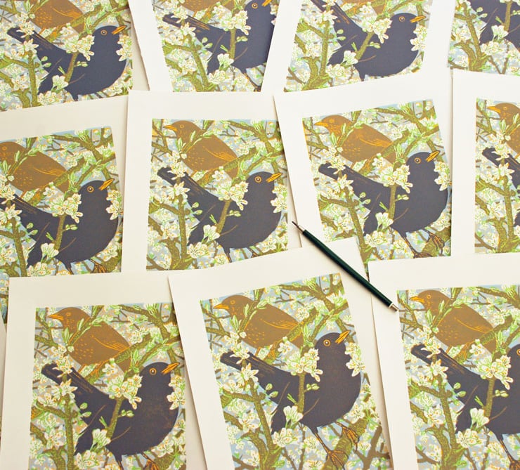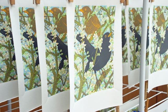 'Blackthorn Blackbirds', limited edition linocut print, hand cut and printed on hand press in five colours. Signed, editioned and titled in pencil by the artist.